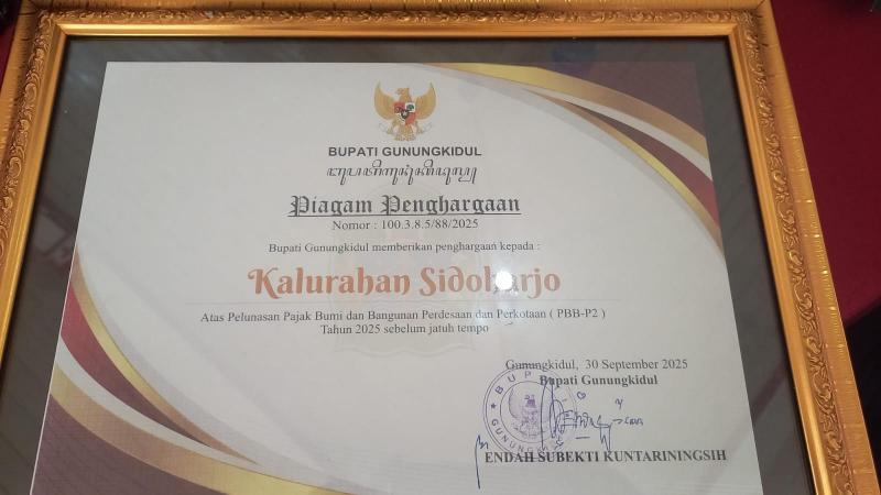 Keberhasilan Kalurahan Sidoharjo dalam mendorong kesadaran masyarakat untuk membayar Pajak Bumi dan Bangunan Perdesaan dan Perkotaan (PBB-P2) kembali diukir dengan diraihnya penghargaan untuk kategori Lunas PBB-P2. Penghargaan bergengsi ini diserahkan secara langsung dalam sebuah acara yang digelar di Sewoko Projo, Kamis (30/10/2025).