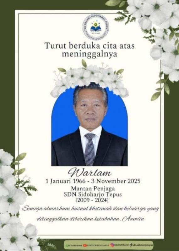 Kabar duka menyelimuti Padukuhan Pulegundes I, Kalurahan Sidoharjo, Kapanewon Tepus. Almarhum Bapak Warlam telah berpulang ke Rahmatullah pada hari Senin, 3 November 2025. Kepergiannya menjadi kehilangan yang mendalam bagi keluarga, sanak saudara, dan warga masyarakat.