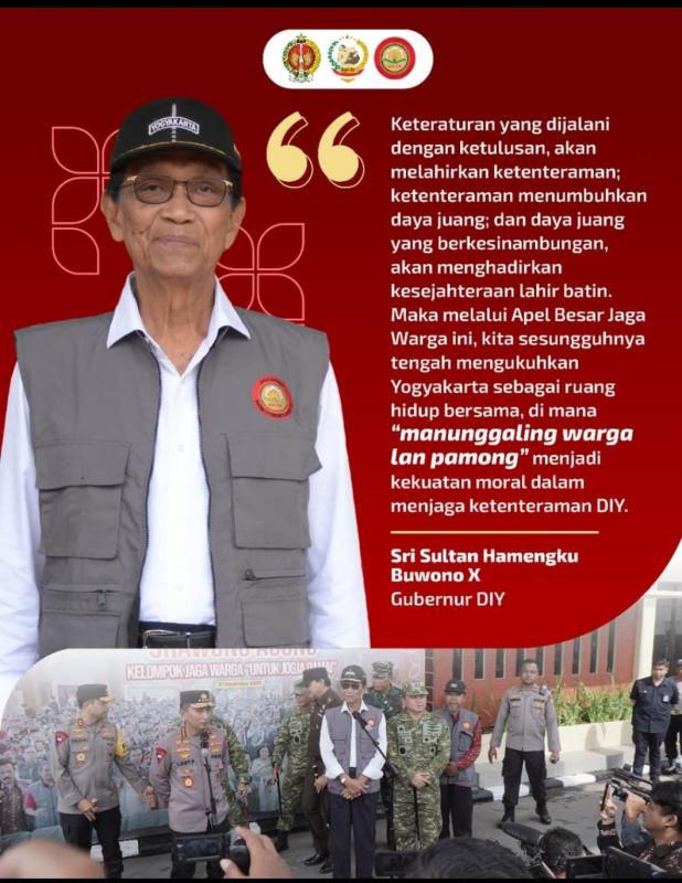 Selain itu, beliau menyoroti pentingnya ketertiban dan ketulusan dalam menjalankan peran menjaga lingkungan. Ketenteraman dinilai sebagai fondasi yang menumbuhkan daya juang dan kesejahteraan lahir batin. Melalui Apel Besar Jaga Warga, kembali ditegaskan pentingnya memperkuat kebersamaan antara warga dan pamong sebagai kekuatan moral dalam menjaga ketenteraman DIY.