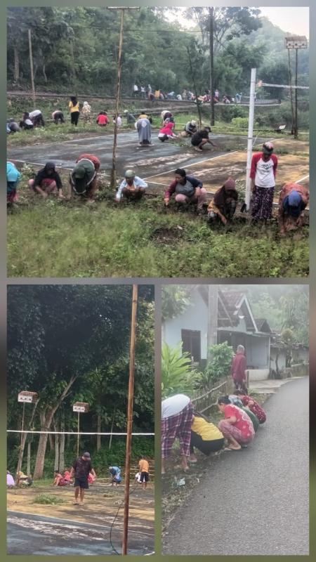 Kerja bakti difokuskan pada pembersihan lingkungan sekitar, termasuk membersihkan rumput liar, saluran air, serta area fasilitas umum dan bahu jalan. Selain itu, warga juga membersihkan lapangan dan area sekitar telaga agar tetap bersih dan nyaman digunakan.