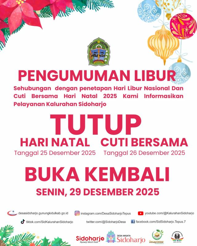 Dalam pamflet yang disampaikan, diinformasikan bahwa pelayanan di Kantor Kalurahan Sidoharjo tutup pada hari Rabu, 25 Desember 2025 sehubungan dengan Libur Nasional Hari Raya Natal, serta Kamis, 26 Desember 2025 sebagai cuti bersama.