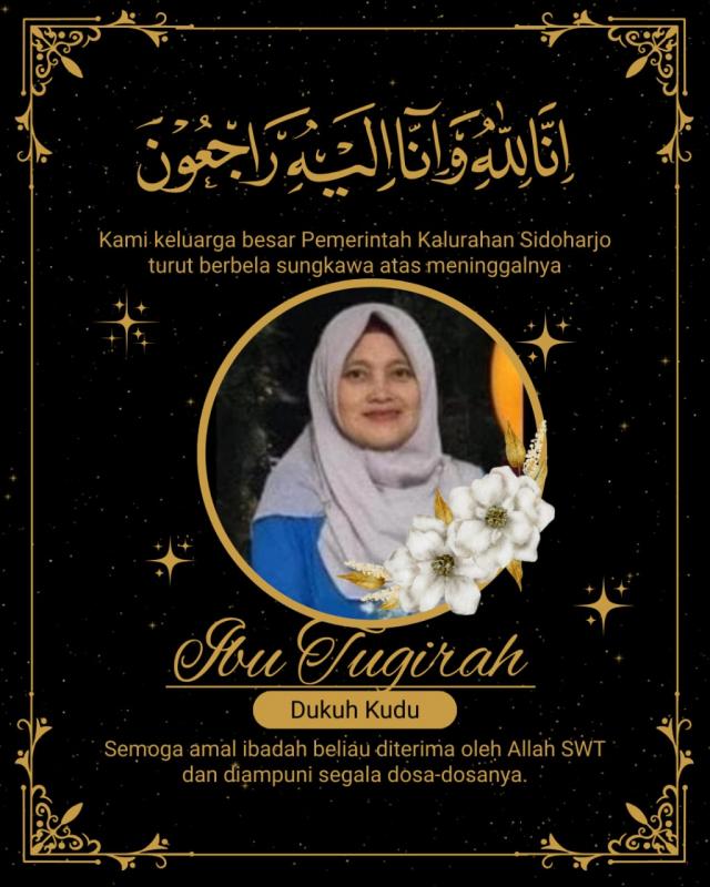 Sidoharjo (SIDA) - Segenap keluarga besar Pemerintah Kalurahan Sidoharjo menyampaikan ucapan turut berduka cita yang sedalam-dalamnya atas wafatnya Ibu Tugirah, S.Pd.I, yang menjabat sebagai Dukuh Kudu Kalurahan Ngestirejo, Kapanewon Tanjungsari. Almarhumah dikenal sebagai sosok yang berdedikasi, berintegritas, serta memiliki kepedulian tinggi dalam menjalankan tugas pengabdian kepada masyarakat.