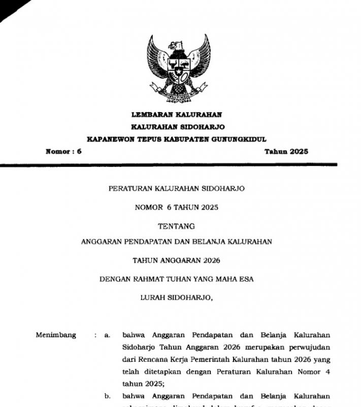 PERATURAN KALURAHAN NOMOR 6 TAHUN 2025 TENTANG ANGGARAN PENDAPATAN DAN BELANJA KALURAHAN TAHUN 2026