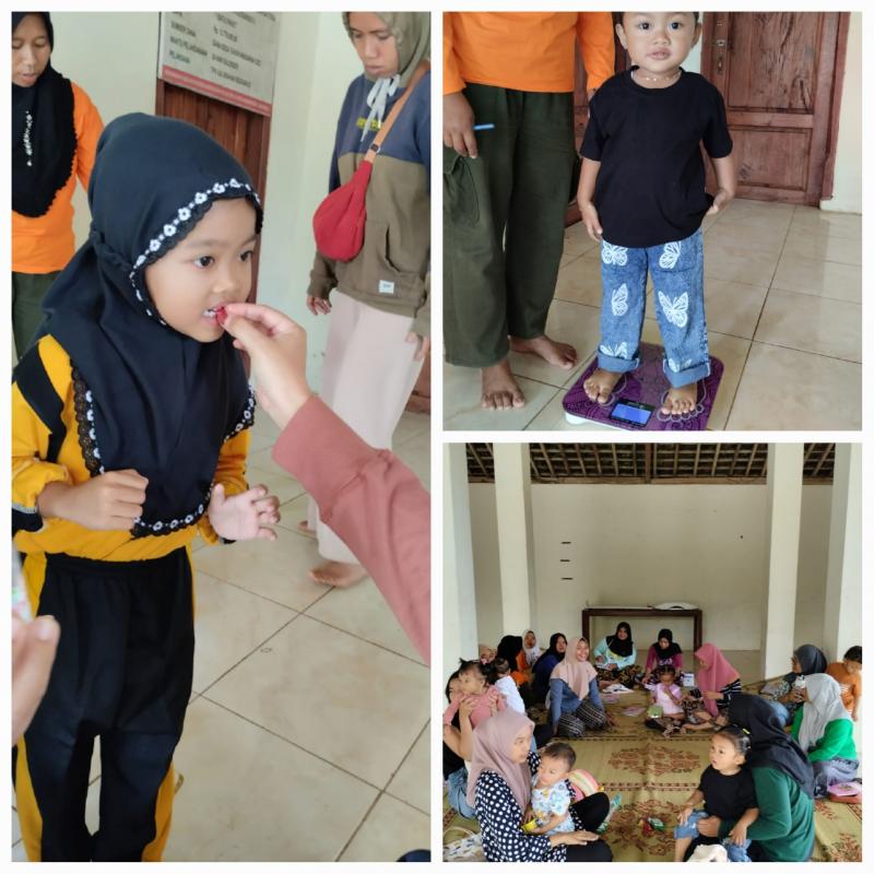 Dalam pelaksanaan kali ini, selain pelayanan rutin seperti penimbangan balita dan pemantauan tumbuh kembang anak, juga dilakukan pemberian Vitamin A kepada balita. Pemberian Vitamin A ini bertujuan untuk meningkatkan daya tahan tubuh anak, menjaga kesehatan mata, serta mendukung pertumbuhan dan perkembangan yang optimal.