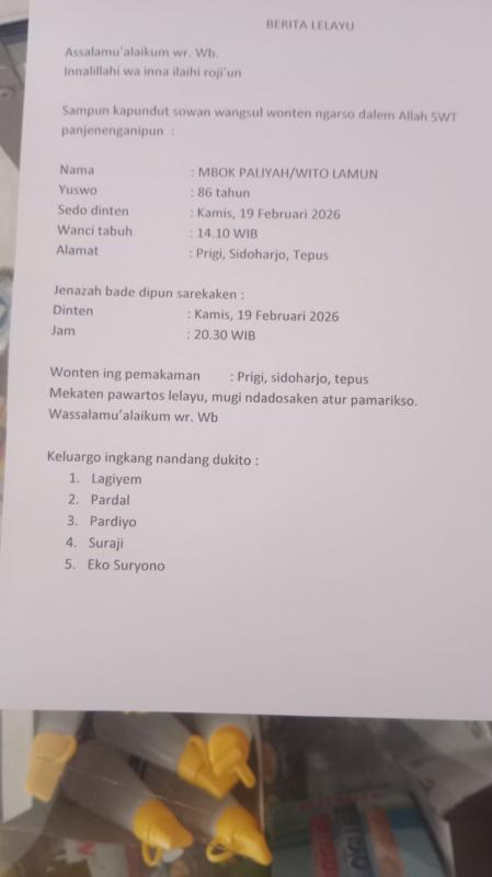 Sidoharjo (SIDA) – Innalillahi wa inna ilaihi roji’un. Telah berpulang ke rahmatullah Mbok Paliyah/Wito Lamun pada usia 86 tahun, pada Kamis, 19 Februari 2026 pukul 14.10 WIB. Almarhumah merupakan warga Padukuhan Prigi, Kalurahan Sidoharjo, Kapanewon Tepus.