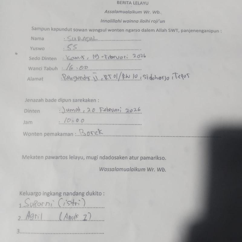 Sidoharjo (SIDA) - Pemerintah Kalurahan Sidoharjo Takziah ke Rumah Duka Warga. Pemerintah Kalurahan Sidoharjo menyampaikan rasa duka cita yang mendalam atas wafatnya salah satu warga Kalurahan Sidoharjo, Bapak Suradal (55 tahun), warga Pulegundes II RT 01 RW 10, Kalurahan Sidoharjo, Kapanewon Tepus.