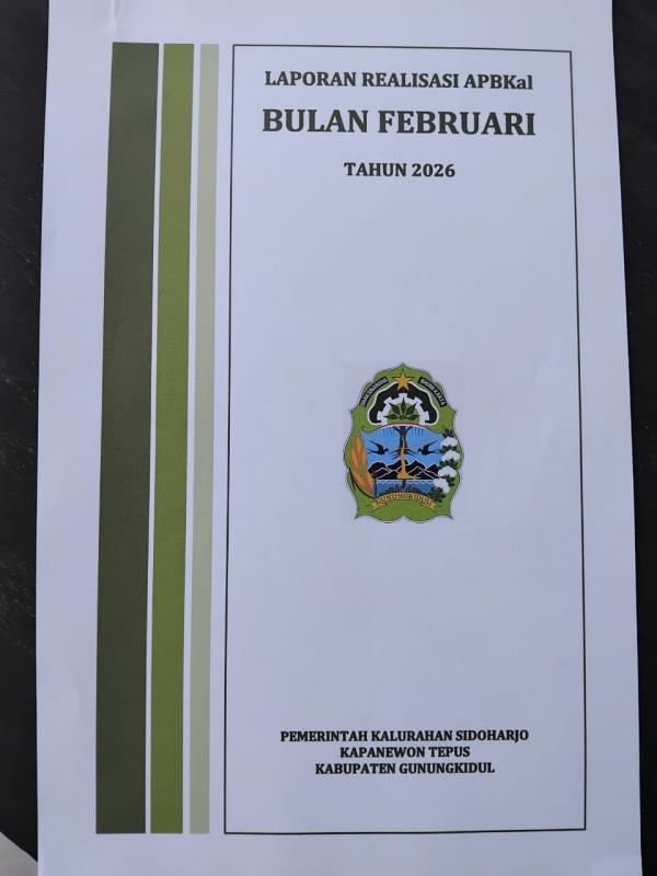 Sidoharjo (SIDA), Penyampaian Laporan Realisasi APBKal Februari. Selasa, 3 Maret 2026. Laporan realisasi APBKal Februari disampaikan kepada Bupati melalui Kapanewon. Setiap bulan pemerintah Kalurahan melaksanakan tutup buku dan melaporkan hasil pelaksanaan APBKal per bulan. Laporan ini menjadi bentuk pertanggungjawaban kalurahan setiap bulannya. Secara tertib Pemerintah Kalurahan Sidoharjo menyampaikan laporan bulanan ini sebelum tanggal 10 sesuai ketentuan Peraturan Bupati yang berlaku untuk pengelolaan keuangan di kalurahan.