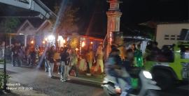 Terlihat salah satu ikon menarik berupa replika berbentuk karakter unik yang diarak bersama rombongan, menarik perhatian warga yang menyaksikan di sepanjang rute. Suasana semakin hidup dengan cahaya obor yang menerangi jalan serta lantunan takbir yang menggema.