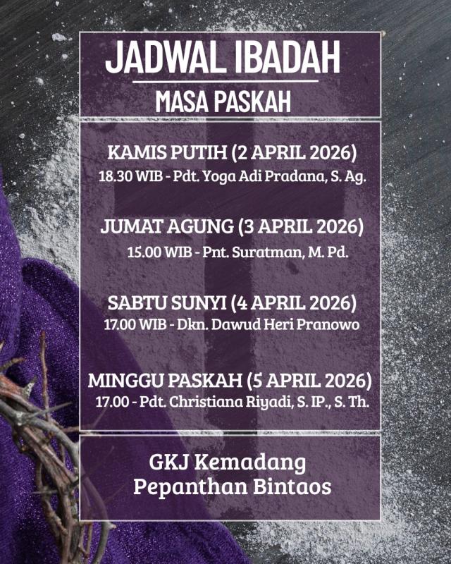 Kegiatan ini merupakan bagian dari rangkaian ibadah Masa Paskah di GKJ Kemadang Pepanthan Bintaos, yang diawali dengan ibadah Kamis Putih pada 2 April 2026 pukul 18.30 WIB dipimpin oleh Pdt. Yoga Adi Pradana, S.Ag. Selanjutnya, setelah Jumat Agung, akan dilaksanakan ibadah Sabtu Sunyi pada 4 April 2026 pukul 17.00 WIB dipimpin oleh Dkn. Dawud Heri Pranowo, serta puncaknya ibadah Minggu Paskah pada 5 April 2026 pukul 17.00 WIB yang dipimpin oleh Pdt. Christiana Riyadi, S.IP., S.Th.