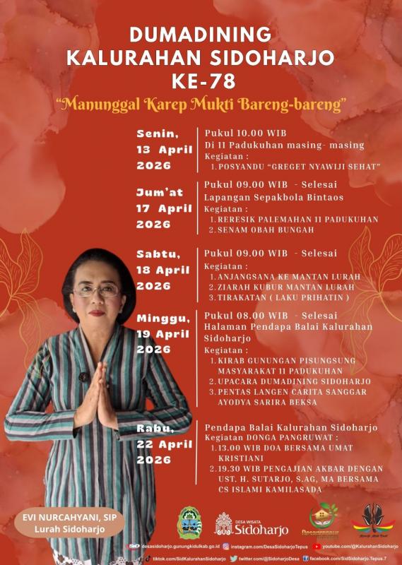 Lurah Sidoharjo, Evi Nurcahyani, SIP, mengajak seluruh masyarakat untuk berpartisipasi aktif dalam setiap rangkaian kegiatan sebagai bentuk rasa memiliki dan kebanggaan terhadap Kalurahan Sidoharjo.
